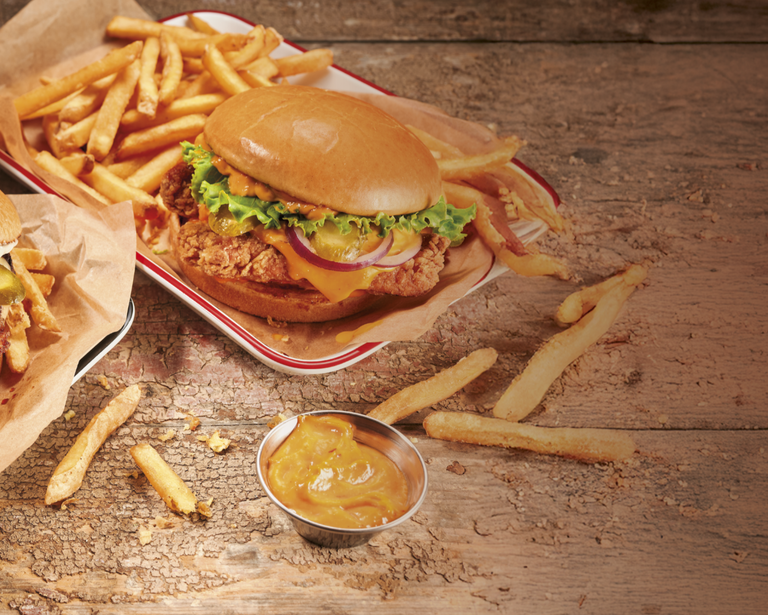 (7)Accompagnements et sauces à volonté hors menus, potato burger, salades, œuf poché à l’américaine, texas fries, et mac&cheese.