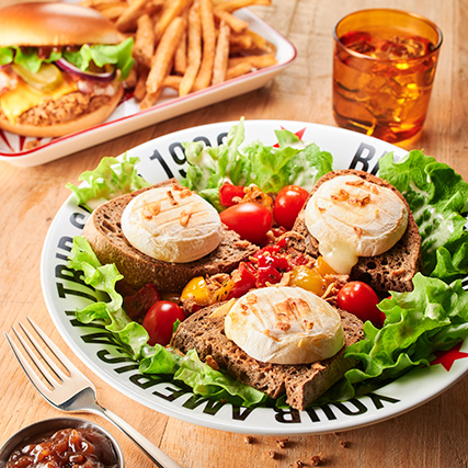 Salade batavia, chèvre affiné sur toasts de pain aux céréales, sauce confit d'oignons, duo poivrons rôtis au paprika, tomates cerises, oignons frits, sauce Buffalo.