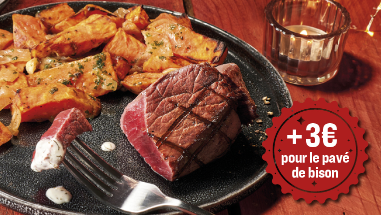 Un menu généreux à déguster à deux, ça vous tente ? Brochette de bœuf, pavé de bison (+3€) ou encore un pavé de saumon aux épices cajun, à vous de choisir ! Côté sucré, vous avez le choix entre notre délicieuse brioche perdue, dame blanche ou coupe glacée.