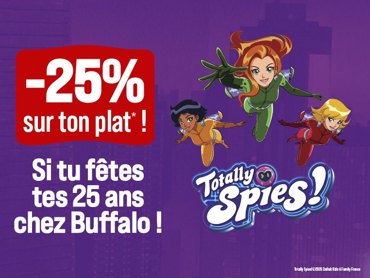 A tous ceux qui fêteront leurs 25 ans entre le 16 février et le 26 avril 2026, Buffalo Grill et les Spies vous invitent à célébrer votre anniversaire en restaurant… et à profiter de 25% de réduction sur votre plat* !